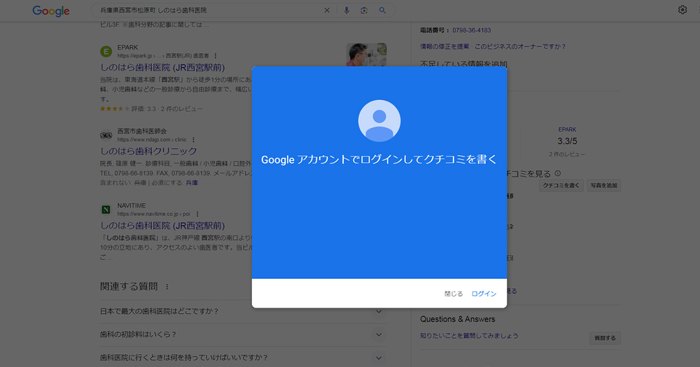 Googleの検索画面を開き、クチコミを投稿したいお店や場所を検索します。