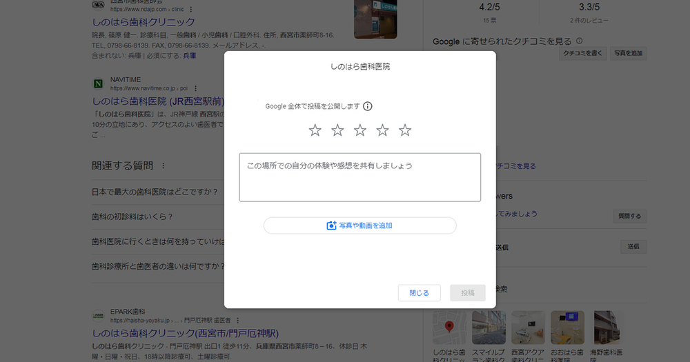 クチコミの入力フォームがポップアップするので、クチコミを書いたり写真をアップロードする。