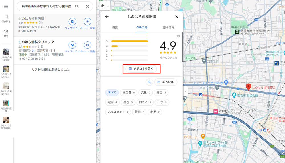 ビジネス情報が表示されたら、左側のパネルを下にスクロールし、「クチコミを書く」ボタンをクリックします。