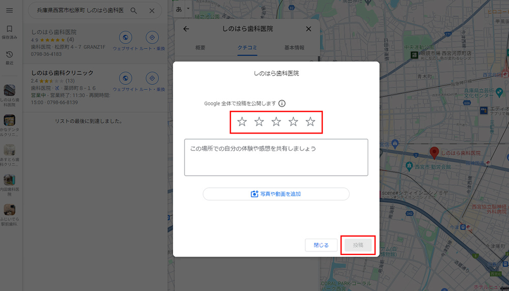 ログインすると、星評価を付けたり、説明を加えたり、写真をアップロードしたりできる入力フォームが表示されます。記入し終わったら「投稿」ボタンをクリックします。