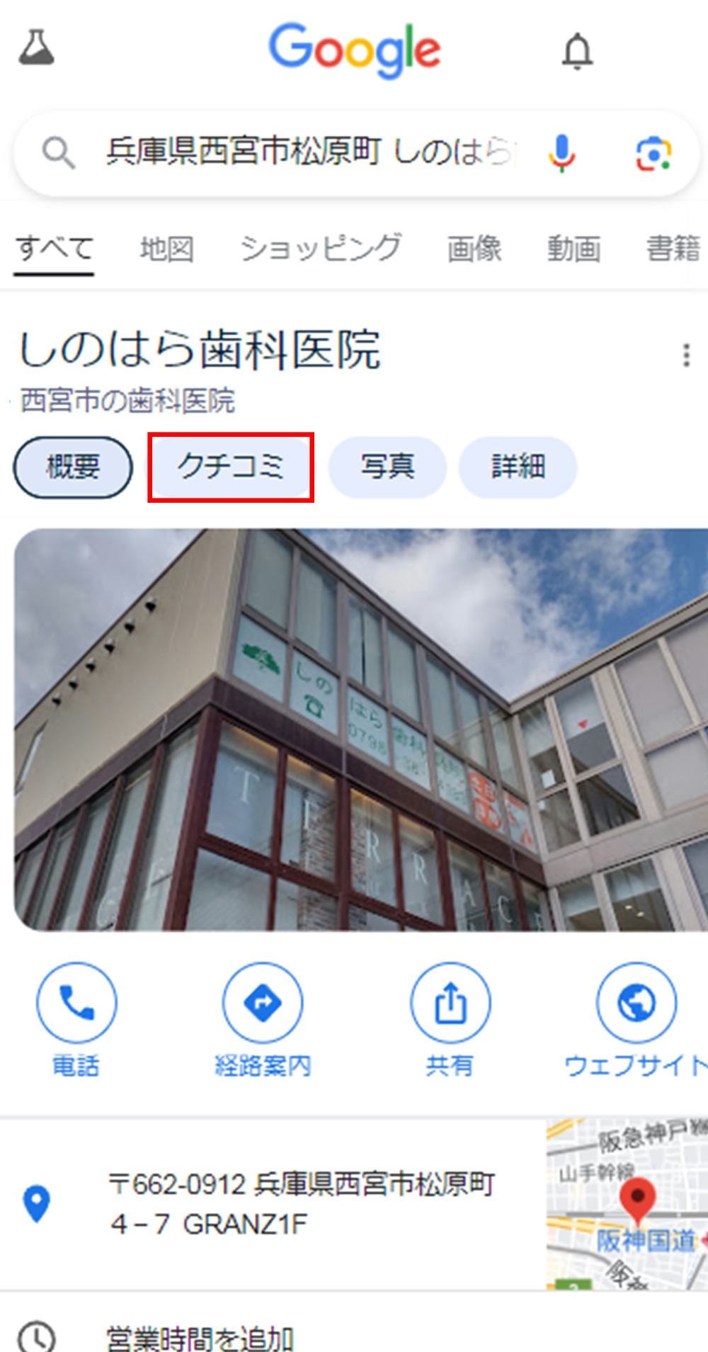 検索結果に表示されるビジネスプロフィールの中にある、「クチコミ」タブを開き、星のアイコンをタップする。