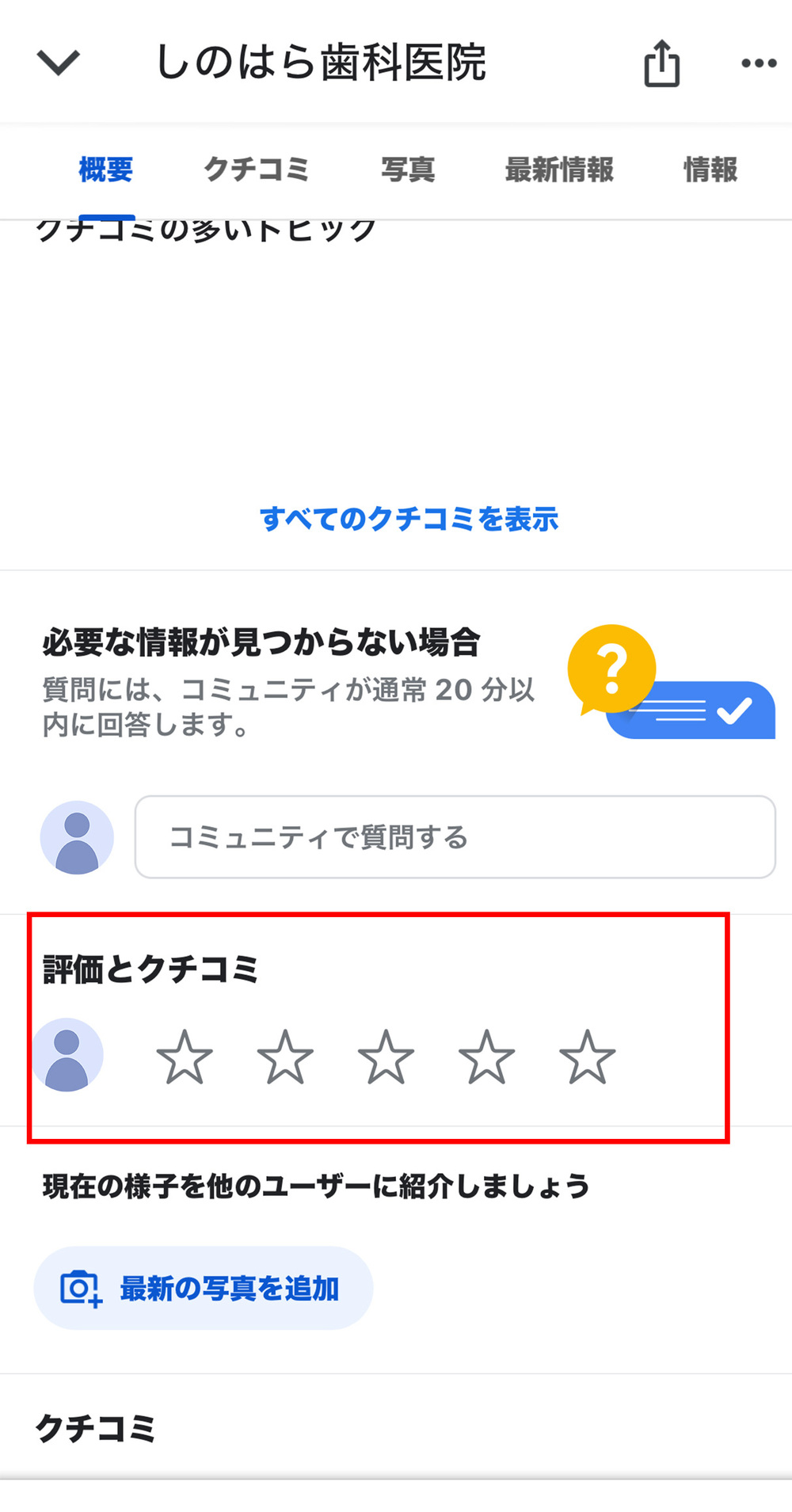 星評価をする:「評価とクチコミ」セクションの「星」アイコンをタップする。